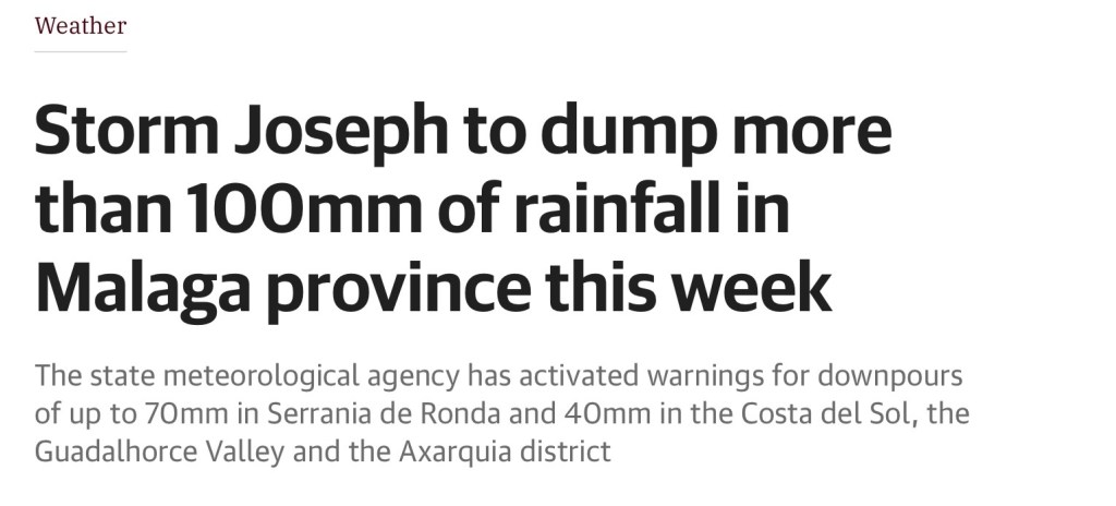 Now of course, it would be rude of me to fail to mention the ‘biggest’ news event for down here in our particular part of the world, although the ‘Costa del Sol’ description has not lived up to its title very recently, well more at the midpoint period of November, for yes, we did have rather a lot of the wet stuff, which believe it or not, for this part of Spain at least, it was actually ‘A Cause For Celebration’, rather than a reason to be miserable like it may be elsewhere. Although I do appreciate that for some reading this, even in other parts of Spain, who live in areas where regular rainfall is a common event and nothing out of the ordinary, this may not actually come as any sort of earth shattering news for you but, in this, our little bubble of existence tucked away in a small corner of Spain, unsalted water still remains a very valuable and precious commodity, but we also know that such wet weather events never last too long so they become moments to appreciate and treasure, okay that is perhaps overstating it just a little 🤭