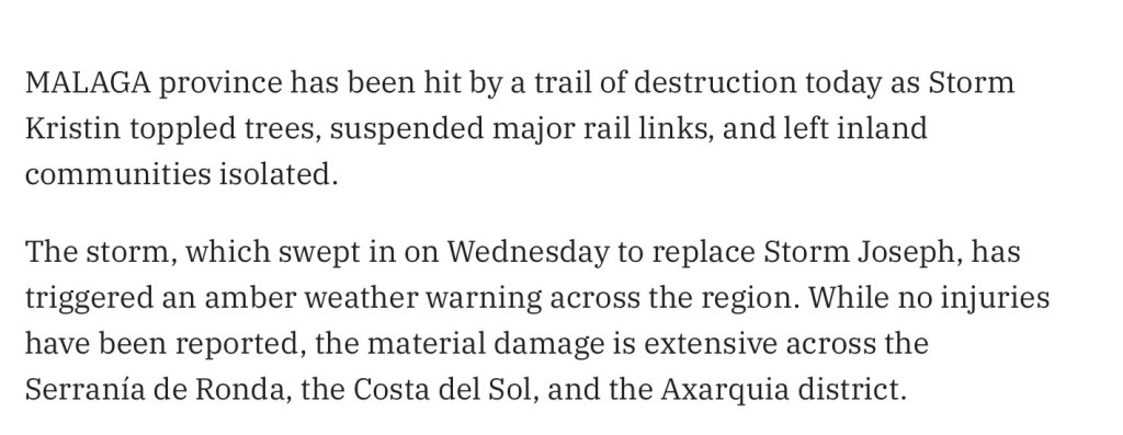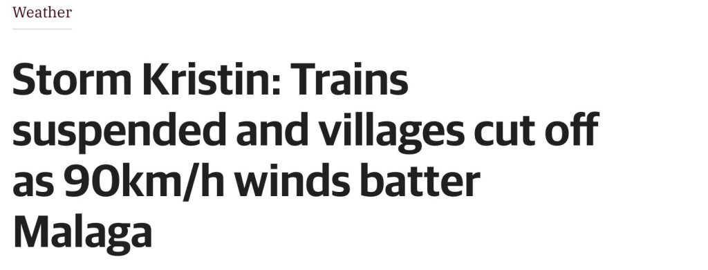 Over the last couple of months, since the beginning of December last year, we have been pestered by the presence of numerous ‘Unwelcome Visitor’s’, they arrive, without being invited, and each one, without fail, overstays their welcome 😲 I will publicly name and shame them here and now, although they already know who they are, Alice, Frances, Ingrid, Harry, Joseph and now Kristin. Okay yes, you have probably already guessed that these particular ‘Unwelcome Visitor’s’ are all major storms, which have followed swiftly on the coat tails of each other providing little, or no, respite from the trail of devastation that each one of them had created, although it has to be said that these trails of devastation have varied dramatically, dependent of course on which areas they had hit the worst, fortunately, in our small corner of the Costa del Sol, we have certainly been spared from any of the more ‘serious’ devastation, only really suffering from the inconvenience of not being able to get out as much for our regular walks. However, and yes, somewhat surprisingly for our area, even the snow had stretched its long white arms down to within 15km (9 miles) of Estepona, and that, I do have to say, is just a little too close for comfort for my liking ! Strange when I think about it now, but this time last year we were actually praying for ‘some’ rain, in order to end the previous two year’s of severe drought but now, we are frantically praying for it all to just stop, I guess we are just never happy eh ! 😂