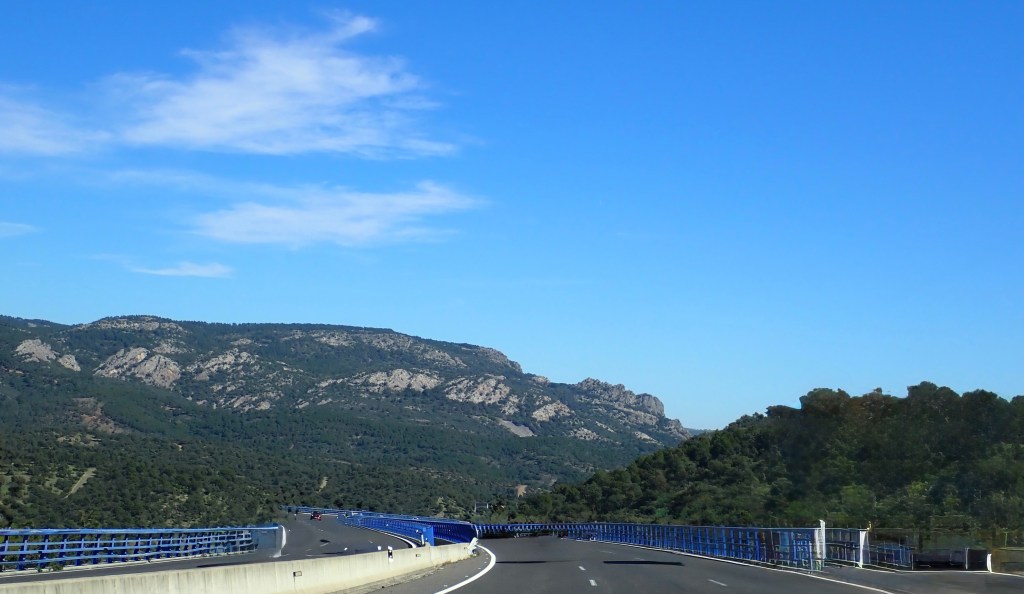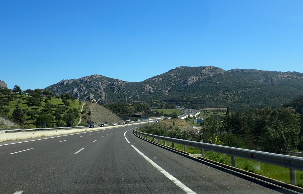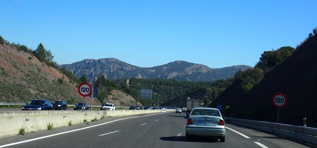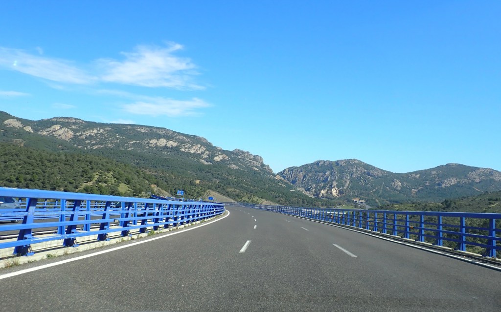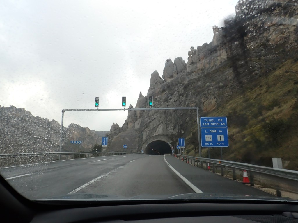 We pulled out from our car park at 07:20am, now normally my OCD Buddy would be in a state of high anxiety at this point, after all, we had scheduled ourselves to depart promptly at 07:00am, but even he appeared to be in holiday mode and was quite chillaxed about the twenty minute delay. It was daylight, the sun was up, although it was still low in the sky, necessitating the need to wear sunglasses even at that early hour of the morning 😎 but it was already 12 degrees(c), so at least we had a good dry start to our long drive. The ‘Works of Fiction’ though, forecasted that we would encounter the start of the wet stuff before we even reached Madrid, some six hours drive away and to be honest, we would be spending a lot more time driving at higher altitudes, so I guess we would be very much closer to any threatening rain clouds 😉 It made me remember that, although you only really think of the more popular mountainous areas in Spain as being the ‘Sierra Nevada’, Picos de Europa or the Pyrenees, the rest of Spain, North to South, has very many more mountainous regions and, as the bulk of our journey would primarily be inland, we would be travelling through a great deal of them, so we would just have to wait and see how long it would be before the sunglasses had to be removed.