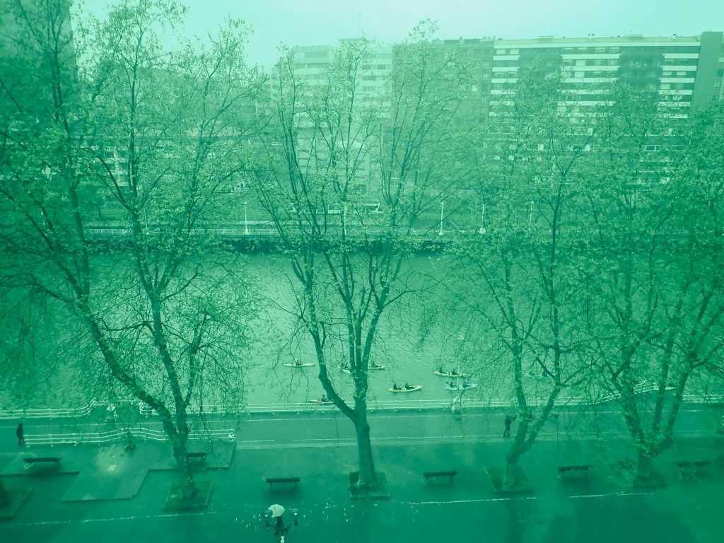 The external temperature dropped significantly, at the highest altitude it dropped as low as 5 degrees(c) and we had to put the car heater on 🥶 The scenery changed too, there was much more lush green pastures, thick green forests, a tell tale sign that this area experiences a lot more of the wet stuff than we do down South. The higher we climbed the more the mountains became barren craggy rock faces and, rather than the roads cutting through the valleys and between the peaks, we were now encountering more and more tunnels that cut straight through them, and then, the first spots of rain appeared on the windscreen. But we were not downbeat, we had covered virtually 80% of our journey in beautiful sunshine, much more than we had anticipated given the forecasts provided by you know who 🙄 We made one more stop for a ‘Comfort Break’ and Coffee stop, we changed driving positions so as to give Shazza a break, she would take over again just before we reached the outskirts of Bilbao. With the impediment in my right eye, Shazza was very much better better at manoeuvring her way through busy city streets, I was better at navigating and guiding her through those streets, letting her concentrate on the traffic, bus lanes, traffic lights, pedestrian crossings etc. and I could give her advance notifications on how far in front each turning was, which lane to be in, and this actually generally works out quite well for us.