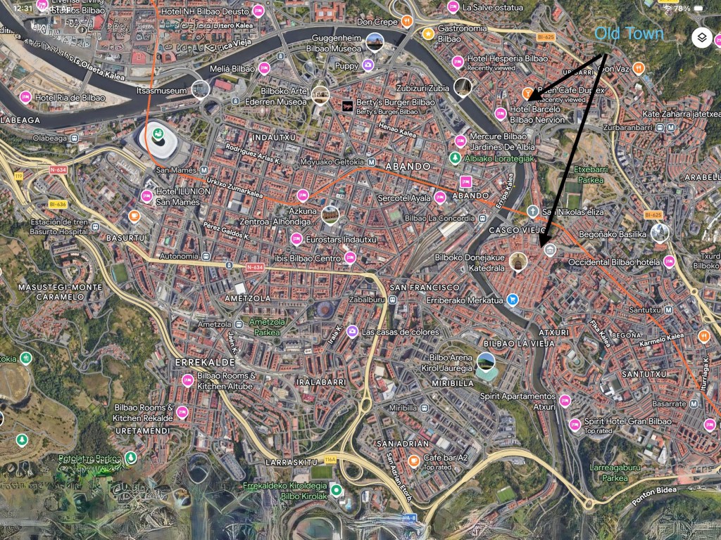 Our hotel room directly overlooked the tidal ‘River Nervion’ which eventually flows out into the Bay of Biscay, and was located on the Eastern side of the city, within the ‘Old Town’ district. On the opposite bank was the newer and much larger modern side and, weather permitting, over the next couple of days we would attempt to explore both. But first we needed a little bit of sustenance and this particular morning’s breakfast establishment was, according to ‘Mr Google’, just a short twelve minute stroll away, what he didn’t reveal was that ten minutes of that walk was all uphill, Shazza certainly didn’t rush to thank me for that one 😮💨