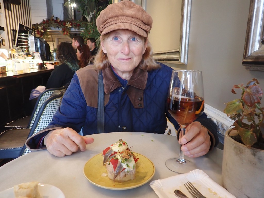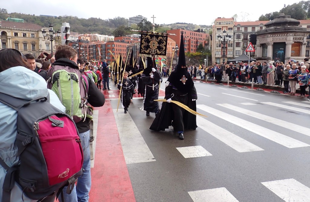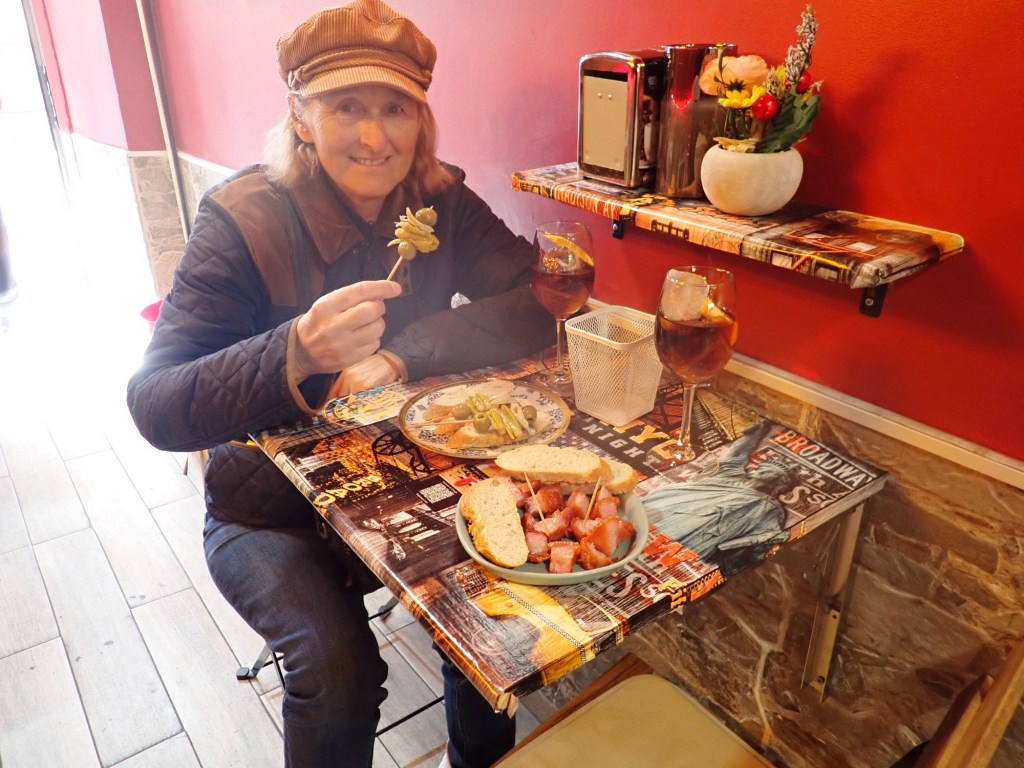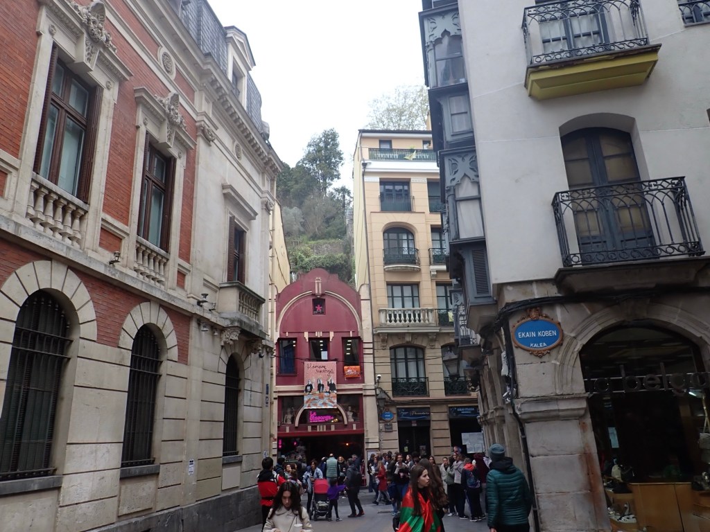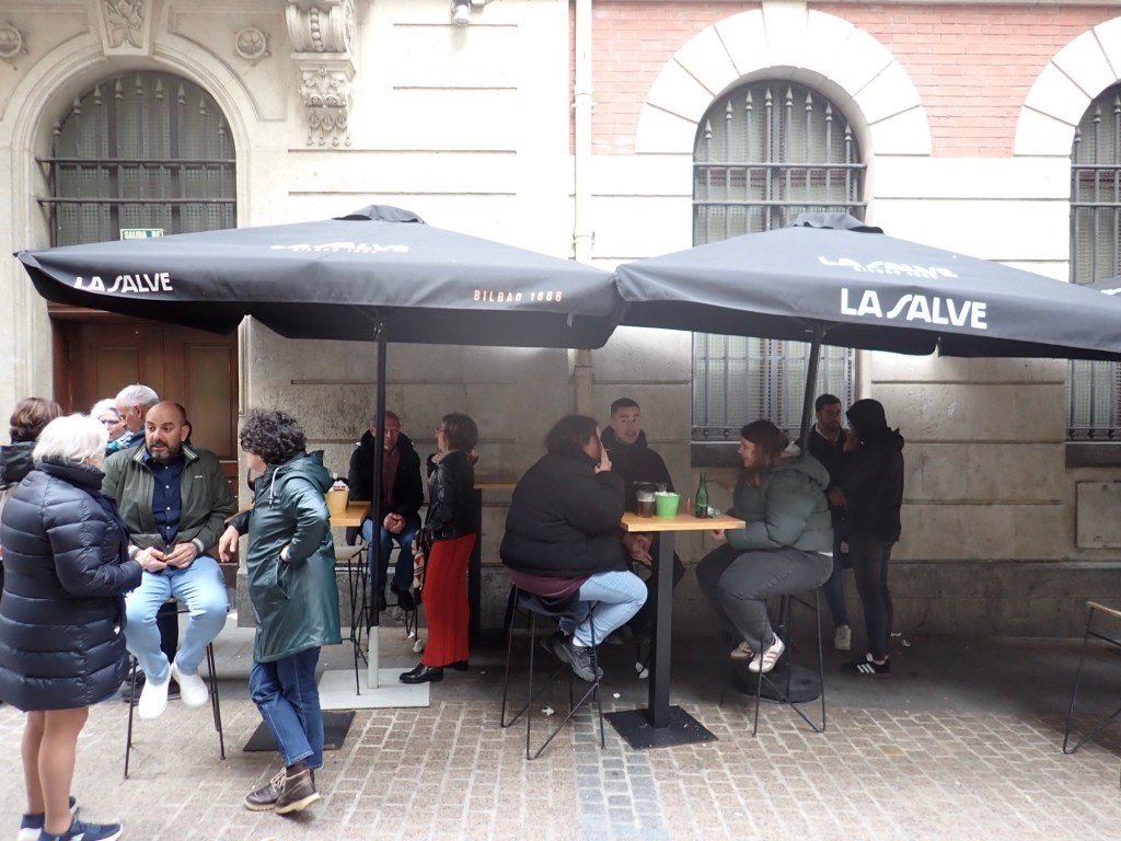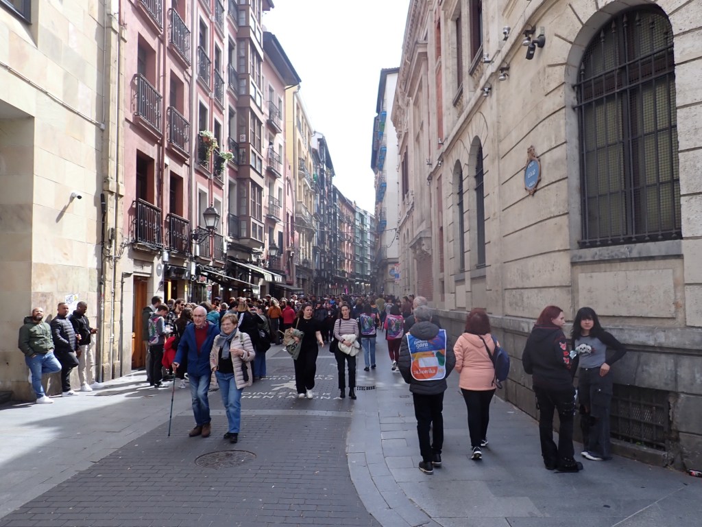 We turned away from the river and into the narrow paved streets, there were primarily 3-4 storey high buildings, of differing colours and designs, many had local retail outlets at ground level, fruiterias, mini-markets, pastelerias, clothes, shoes, hardware stores and of course small bars, in fact a lot of small bars, in every street we wandered down, and every one was full, with people spilling out onto the narrow streets with their drinks, and plates of Pinxto’s, talking, laughing, and joking. Above were the accommodations, from the number of bell presses outside each door we obviously assumed these were more individual apartments rather than single occupancy dwellings, the Basque flags draped from many of the balconies. We obviously realised that as good and considerate as my OCD Buddy had been, at preparing a small list of hostelries that would be open on a Sunday, this turned out to be no ordinary Sunday and we would not be short of choices, provided that we were prepared to wait our turn in getting to the bar area. Of course, these were the traditional ‘Pinxtos’ Bars, we made sure we did not make the mistake of referring to them as ‘Tapas’, that would almost certainly have got us lynched 😲 So, when in Rome, as the saying goes, although we were in Bilbao, today’s lunch would comprise of what the British call a ‘Pub Crawl’, well we would be on the equivalent, ‘A Pinxtos and Vermut’ bar crawl, note not my typical Anti-Covid Vaccine of choice🍷 but it was my second favourite so I wasn’t complaining 😉 and, as Shazza had no reasonable excuse as she had no driving to do, she elected to join me and I knew then that this day could get, on a personal basis, quite messy 😳 Whilst we were in several different bars we heard the music and as we looked out we could see the ‘white hooded’ processions passing by, there was no way I was going to risk fighting my way back out to grab a photo, so you will just have to take my word for it.