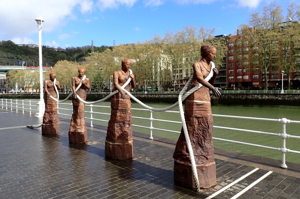 Another thing that I do enjoy is walking along Riverside promenades, this one in Bilbao can be walked on both sides and at several locations, on both sides, are various sculptures, some just modern art sort of stuff and other’s are statues of various people or scenes. There was one that we came across with four women dragging rope but there was no explanation of what they were representing. It had intrigued me, to the extent that I had to do some research to discover whether this was just an artistic sort of thing with no particular relevance, or……………….🤔