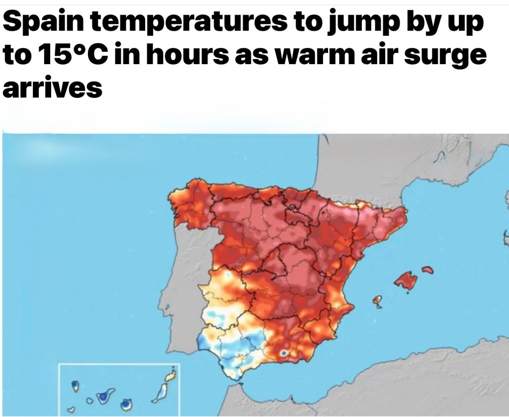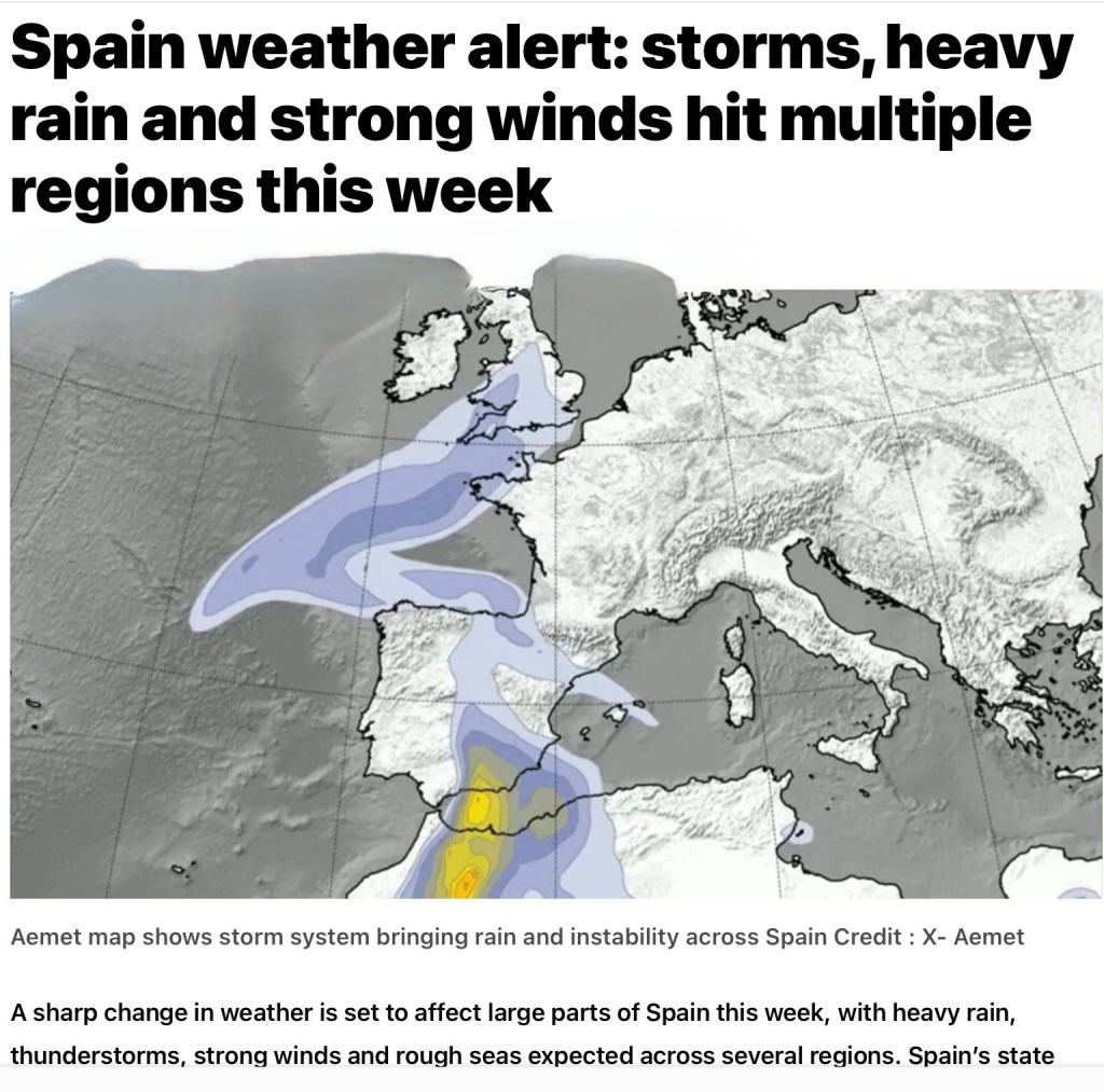 I was looking at the ‘Works of Fiction’ forecasts for the period when we got off the ferry, just casually looking to where we may be on Shazza’s actual Birthday. I was hoping to try and surprise her by pre-booking, without her knowledge, a nice luxury hotel for perhaps a 3-4 night stay, with either an outdoor swimming pool with a bar, or one that was beachfront, just so that she could totally relax and unwind a bit after all our travelling. But to our horror the original ‘Works of Fiction’ forecast had changed completely, and now the Spanish Media and ‘Works of Fiction’ were in cahoots with each other and had updated their last sunny predictions to this.