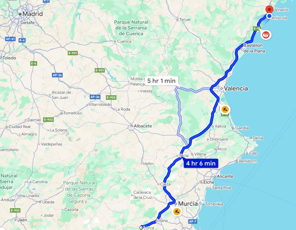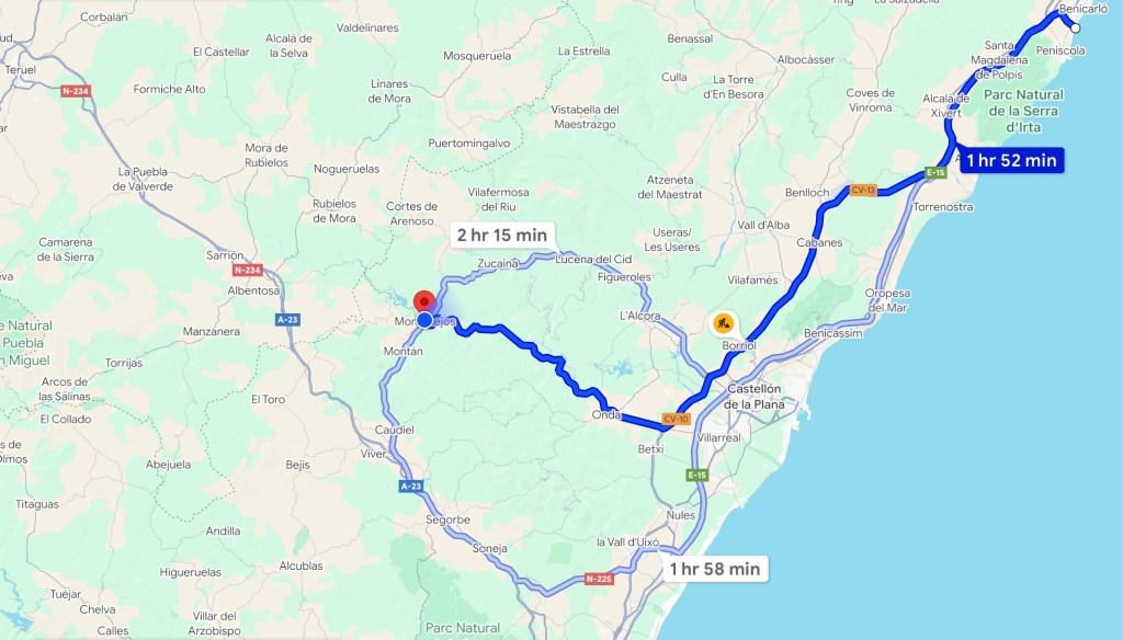 Whilst Shazza had been enjoying herself in the sea, and apart from me being entertained watching her, and the other’s, battle with the waves, as well as obviously being engaged in a fair bit of both ‘people’ and ‘boat’ watching, I also spent some time researching routes, and accommodations, for the next part of our adventure. On my original route I had planned to head a little further North, but go a little more inland, I had been using a guide book that gave ‘Spanish Driving Routes’, and had found one route in the area that would cover two small historic towns/villages in the one day, the first being a relatively short ninety-minute drive away from ‘Peñíscola’ and, the second just a further one hour drive away from their. But by the time it would have taken us to drive to and between both locations, and spent time visiting them both on foot, making the stops worthwhile and doing these places some justice, it would be time for an overnight stop. The frustration came when I tried to find suitable available accommodations at such short notice, in or near these locations, and which also had on-site, or nearby, parking. But unless we wanted to book a whole ‘Casa Rural’ property, for a minimum of at least five nights, then it was not going to be and the one’s that did let out individual rooms were all fully booked 🤷♂️ As for Hotels, well we could forget that, they too were very much a case of ‘No Room At Any Of The Inn’s’, perhaps if we had been travelling astride a Donkey, with Shazza in the family way, we may have been offered a stable, although they would have probably have then told us to come back at Christmas 😂 We did consider whether it would be best to just bite the bullet and rent one of the ‘available’ Casa Rural accommodations for the week, using it as a base camp, but most of these places were out in the wild and the places of interest to us, or worthy of visiting, would have involved driving miles each and every day, returning to the accommodation at night, we didn’t fancy that idea. I didn’t give up though and, after running out of all of the usual options, I just started to scroll through ‘Google’ using the search term ‘Places To See” and came across this……………