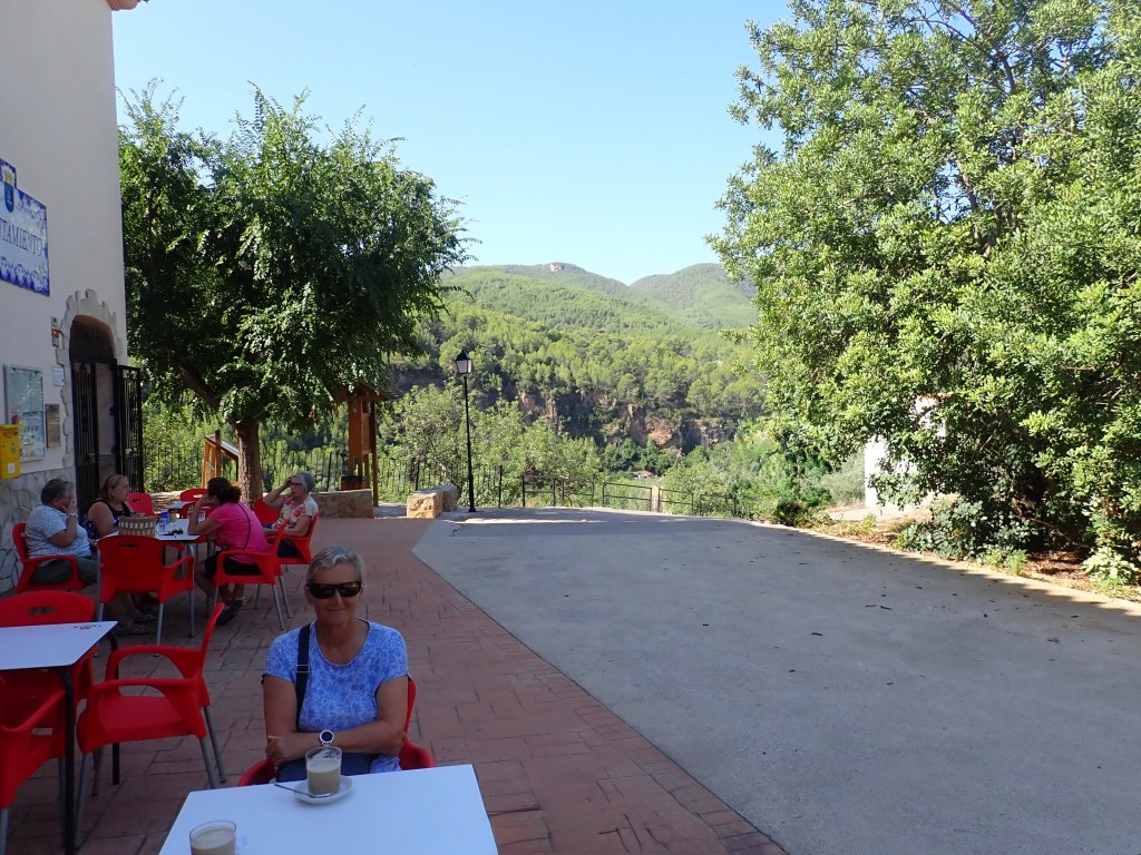 We were in no hurry as ‘officially’ we could not check in to our hotel until 3pm, Sat Nav had us getting there at 1pm 😲 But we decided on a ‘Brunch’ stop, if we could find one in one of the small villages or towns along our route, we could see several picturesque places as we drove along, but many of them were up in the hills and too far off our particular route, however eventually, and we nearly missed the turning, we saw a sign that said ‘Cafe’, right on the turn where it was located but which you couldn’t see until you were virtually on top of it, so we followed the narrow gravel road until it came to the outskirts of what looked like a very small hamlet, one of those one horse sort of places, but it had the most amazing views. This was not a typical Cafe/Bar, but a small cafeteria that occupied a small corner of the local community hall. Outside, a handful of white plastic tables and chairs, at one, their were four elderly ladies sat chatting, they stopped their conversation as we approached, smiled and said ‘Buenas Dias’, as if we were regular faces in the village, we returned the pleasantry. A very pleasant young girl who was inside, took our order, our usual, ‘Cafe con Leche y Tostado’s’, she told us to take a seat outside and she would bring them to us.