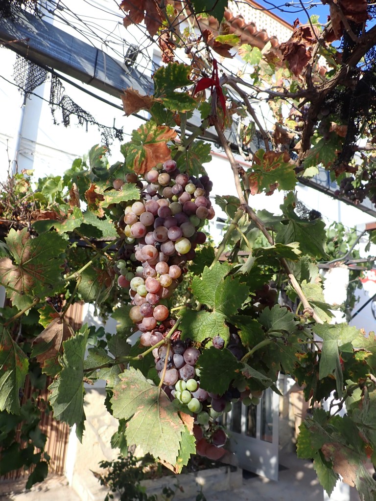 We had made our next stop in a small hilltop village, at a local Bar for a drink and comfort break, as I entered the small dark bar interior to order a couple of cold refreshing beers, there were four elderly men sat around a table playing dominoes, ‘Buenos Tardes’ they said in Unison, without lifting their eyes from the table, I made the instant assumption that this was quite obviously a regular stop for this tourist train as they did not appear at all surprised by this sudden intrusion. There were tables and chairs outside, under a canopy of hanging grape vines, full of their ripe green and red fruits, we all sat around chatting, well Shazza and I listened mainly and only interjected appropriately, when we understood what they were saying. One lady in our group came out with a jar of fresh natural honey she had purchased from the lady bar owner, Shazza suddenly disappeared, and then re-appeared moments later, clutching her own purchase of sweet nectar.