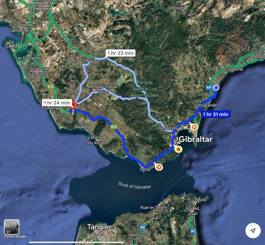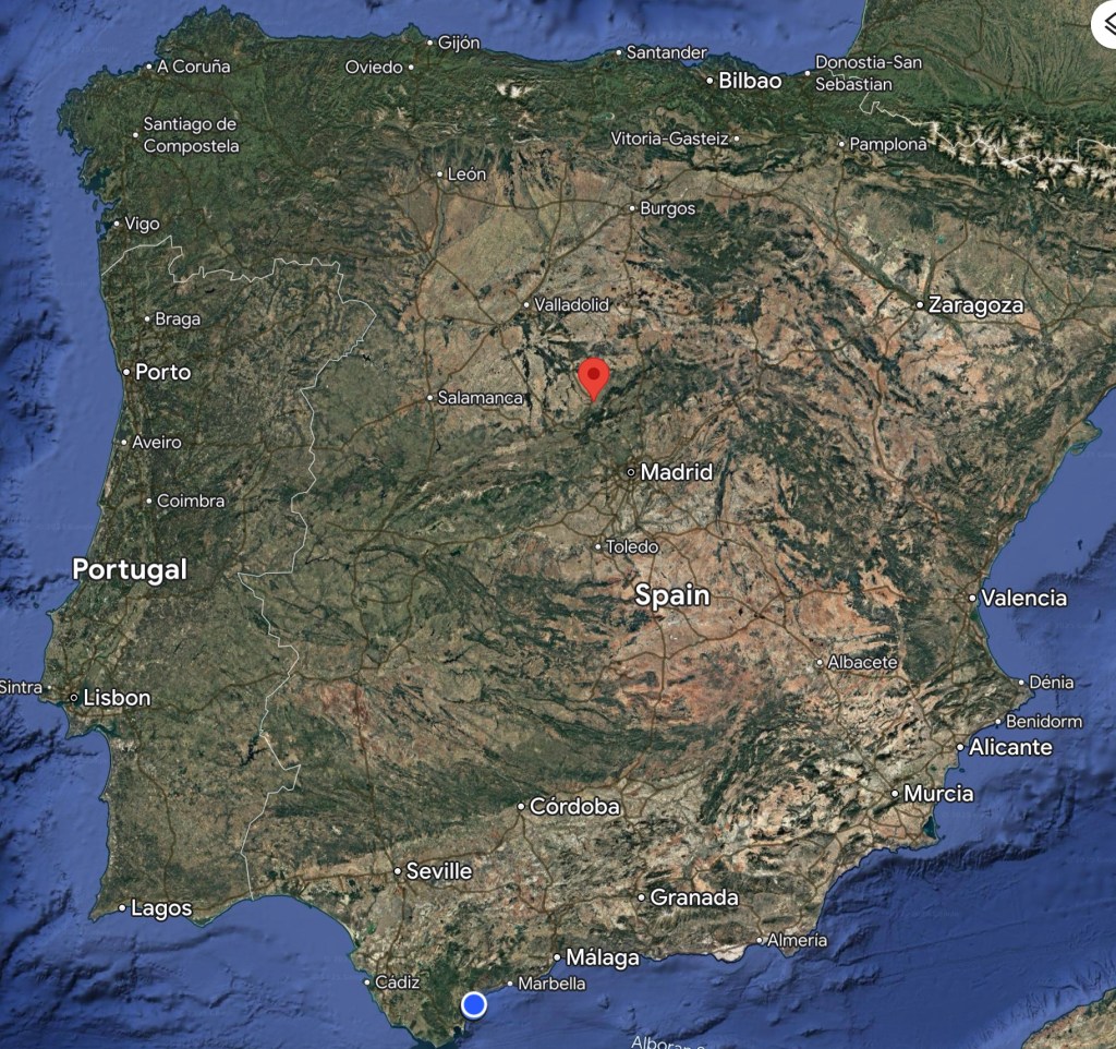 We (Shazza) had decided to make an early start so, the night before our departure, she dusted off the alarm clock and set it for 6:30am 😲 We were pretty much organised beforehand though, I had already put our small individual cases, and a shopping bag of essentials 🤷♂️ into the car the previous evening so that we could get away promptly, and so it was that by 7:30am we were pulling away from the car park. Shazza had decided against wearing shorts, she doesn’t do wet or cold very well and having looked at the forecast for our destination she had talked herself into the safer option, albeit that it was already 17 degrees(c) and felt pretty warm when we departed with dawn just about breaking. With only around six pesky little black dots floating around in my eyeball, I had opted to take the first stint at driving, before the remaining members of the small fly family had awoken and joined them, I had planned on attempting to do around three hour’s before we made the first ‘mandatory’ Shazza breakfast stop, then we would change over driving duties. As it was I managed around two and a half hours before Shazza’s stomach clock required attention, although we also made a further two stops, but just for a coffee and ‘Comfort Break’. In the main the roads were relatively quiet, although getting around Estepona, Malaga and Madrid slowed us down a little more than we had anticipated due to the volume of traffic so, with our driving breaks, it ended up taking us a little over eight hours before eventually arriving at our pre-booked hotel in Segovia. Worth just noting, considering how I like to always mention the customary ineptitude of the ‘Works of Fiction’, from the very pleasantly dry and warm 17 degrees(c) when we departed, the temperature continued to rise steadily in the bright blue sun-filled sky all the way to Segovia, it was 21 degrees(c) when we arrived at 4pm and we had not seen a single drop of rain throughout the whole journey, so we agreed that shorts and tee-shirts would probably have been the better option 🤷♂️