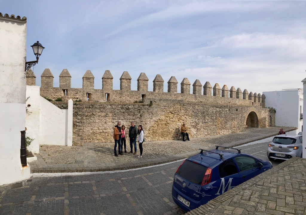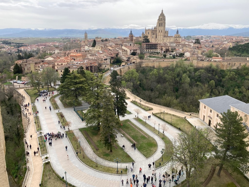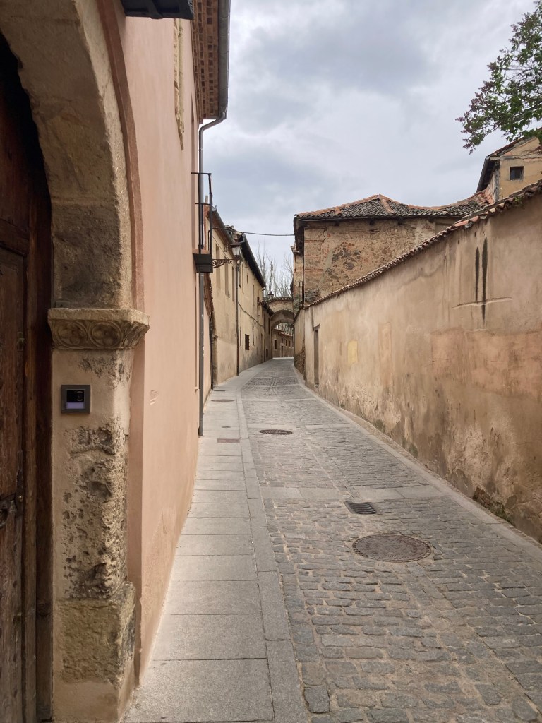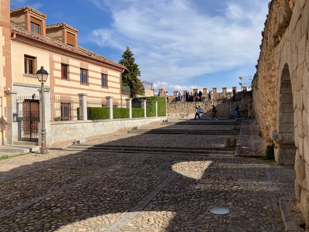 Once outside we found that although the sky was grey, it was actually quite warm and we had to take our rain jackets off and carry them. We took a slightly different route and just followed the old city walls, which took us straight to the Aquaduct Plaza location and then on to the Plaza Mejor and Cathedral, it seemed much quicker than the previous day’s wanderings 🙄 As we passed the Cathedral, which was now open to visitor’s, I checked again with Shazza to see if she had changed her mind about going in for a look around, “We do have all day to do sightseeing there is no hurry” I said to her, but she was quite adamant that she wasn’t really that bothered 🤷♂️ The plaza was eerily quite, lacking any real number of other people, only the odd one or two sat having morning coffee and croissants, we made an assumption that they were probably French tourists as we saw nobody eating either ‘Tostados’ or ‘Churro’s or a ‘Full English’. We wandered along a few narrow cobbled streets until we reached the lower walled ramparts, in several areas along the wall they had viewing platforms, from one of them we could see a side view of the ‘Alcazar’, but it didn’t look that impressive and I began to wonder whether it would be worth the effort once we arrived, as we had been disappointed at a few other Alcazaba’s that we had visited. Whether it was because we had left the protection of the tall buildings in the city, or because we were now in the open, but the temperature seemed to have dropped quite rapidly, forcing us to put our rain jackets back on, although it had still, so far at least, managed to remain dry.