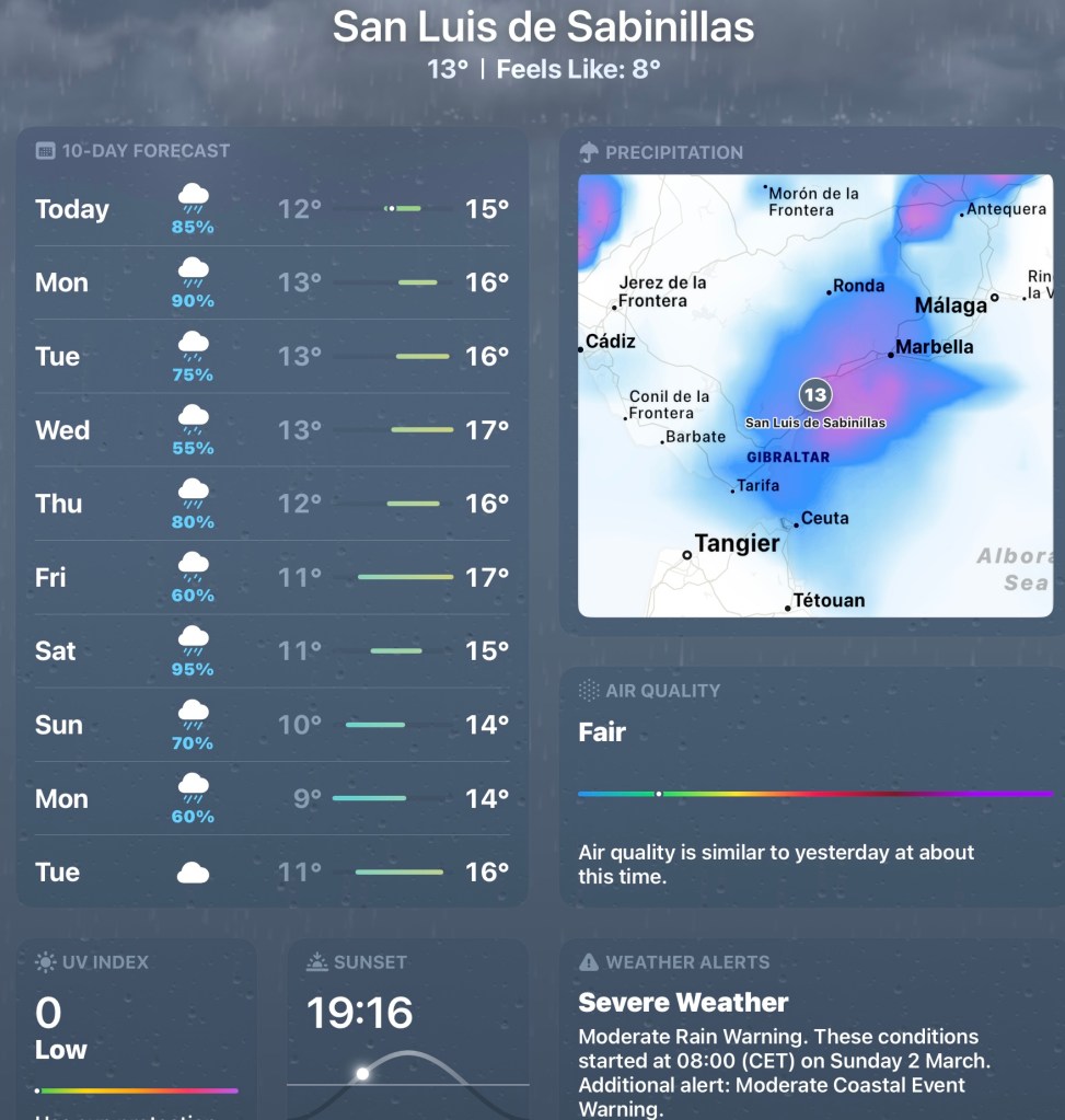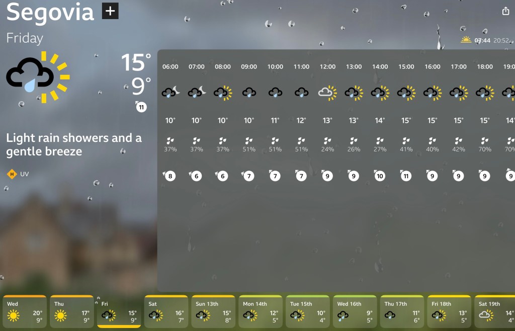 Looking at the ‘Works of Fiction’ forecast before we departed home, it seemed as if it would be touch and go as to whether we managed to get to Segovia before the wet stuff arrived and, disappointingly, our planned full sightseeing day the following day also looked as if that could be a wash out too, so we both just crossed our fingers in the hope that it was just another one of their ‘brain fart’ predictions 🤭