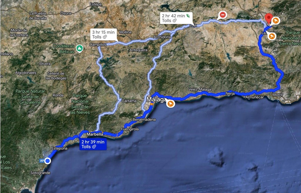 We had a simple travel plan, although we hadn’t told my OCD buddy as we would be attempting to leave him behind on this trip and just trying to go with the flow, rather than having a pre-prepared and timed itinerary. We we would depart homeataround 9:30am and, as we were in no particular hurry to arrive in Granada, as we could not check-in to our pre-booked hotel until 2pm, so on this outward leg of the journey we would take the AP7 (Toll Road) to Malaga, then North up the A46, where we knew of a decent stop to get our usual late breakfast of ‘Cafe con Leche y Tostado’. From there we would then head East, along the A92 which would take us through the spectacular and very scenic mountain ranges before finally dropping into Granada from the North down along the A44, arriving at our hotel at somewhere close to 13:30pm, didn’t I just say that we didn’t have a timed plan 🤭 This is actually another one of those routes that is very familiar to us, having driven along it on numerous occasions over the last nine years or so, in both the Motorhome and the car, when driving North, via Madrid, to get to the ferry port in Bilbao, by way of a change from the Seville route. But we should of course know by now never to make plans, it was just a matter of complete luck, and good fortune, that for some reason before departing home that morning, I had decided to check the route on ‘Google Maps’ on my iPhone, where I discovered that a part of the A92, heading East, was completely closed due to motorway improvements, so we went to Plan B, which we quickly hatched and was to just stay on the A7, the Coastal route, all the way to ‘Motril’, where we would then turn off on to the A44 and head North into Granada, although that now meant that our mid-morning breakfast stop, between Malaga and Granada, would now have to be a ‘Pot Luck’ sort of affair, as we were not as familiar with the service stops along this particular coastal route.