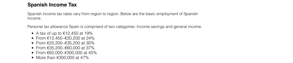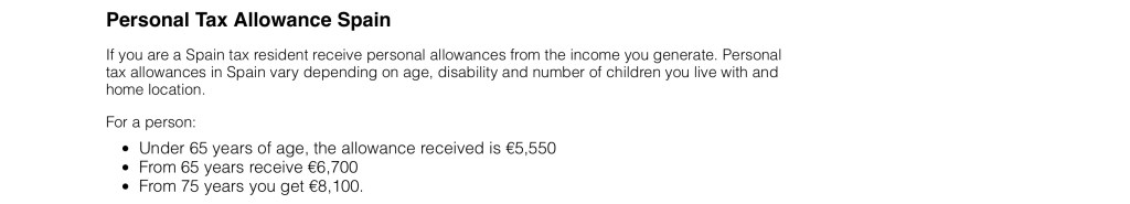 Unlike England, the Spanish Income Tax rates can vary dependent on which Region of Spain you live in AND in Spain their are 6 Tax Band Rates !!These figures are in EURO’s not £’s. Note that the Personal Tax Allowance in Spain is very much less than it is in the UKThis is why it is advisable to seek Professional Tax advice as it may, or may not, be advantageous to submit Individual Tax Returns depending on your own Individual Financial Circumstances