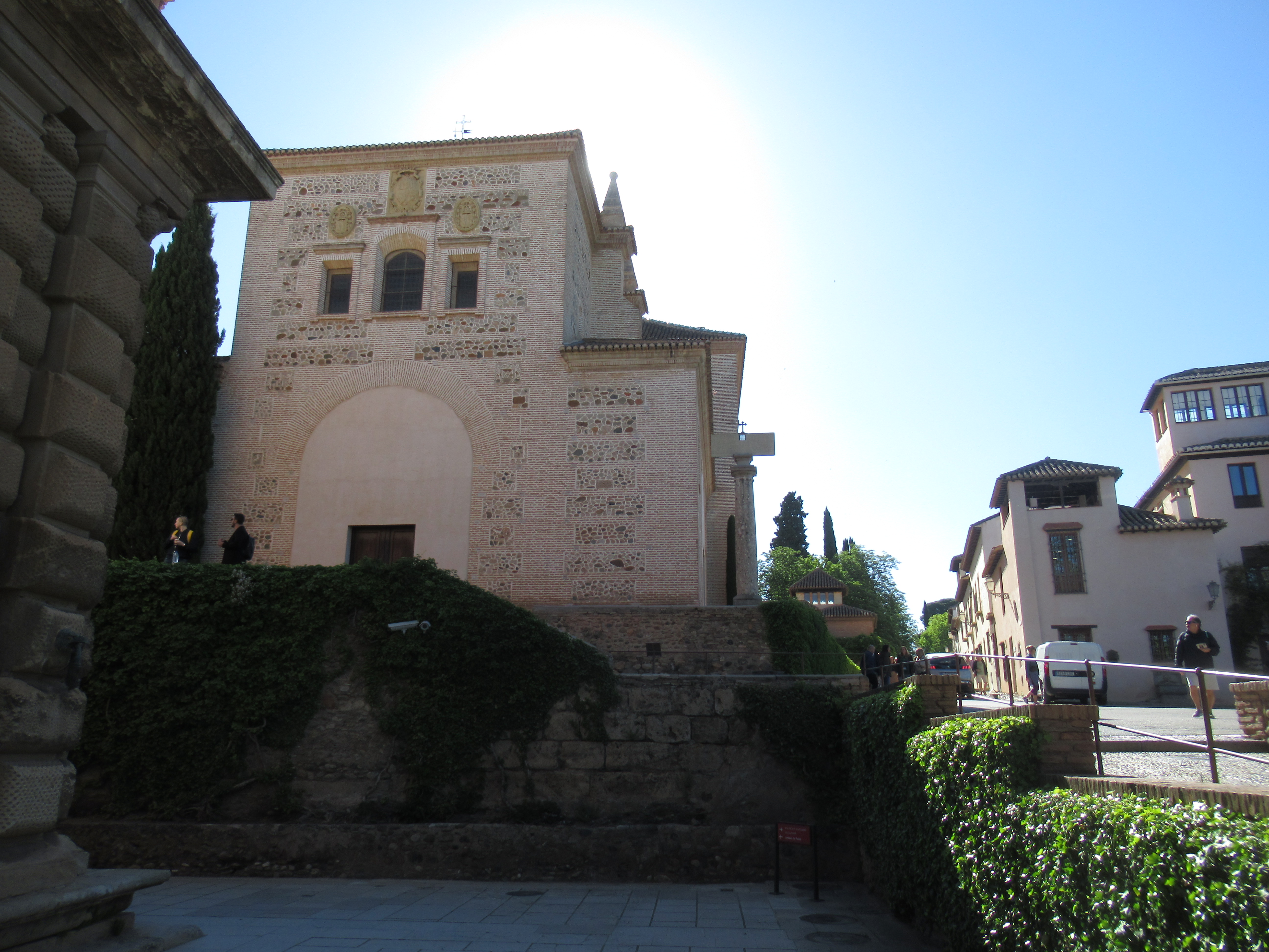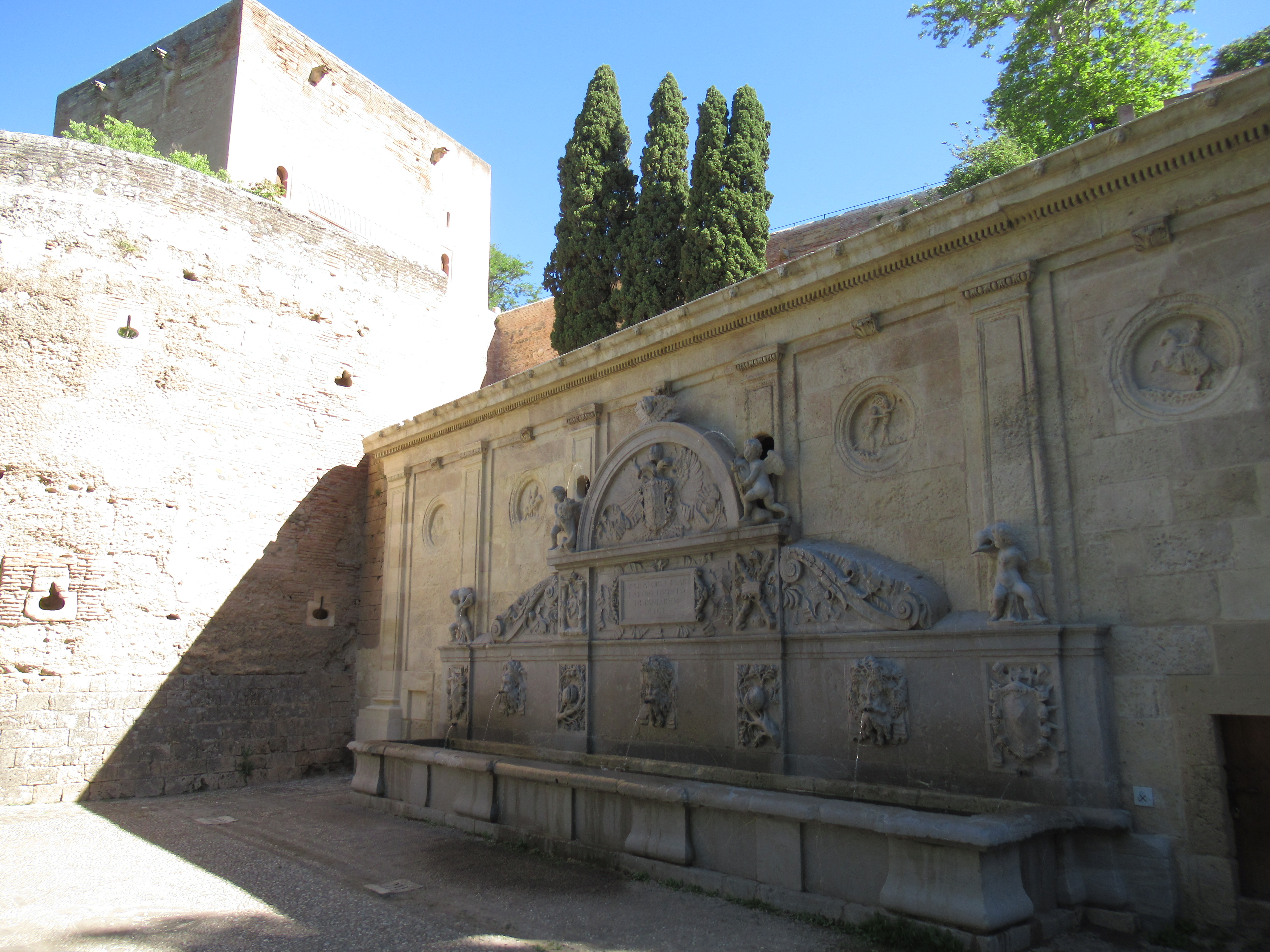 As we stepped outside of the air-conditioned hotel entrance the sun was already high in the sky, it was pleasantly warm but not yet stifling hot, it seemed strange to be looking over the nearby snow capped Sierra Nevada peaks whilst dressed in shorts, short-sleeved tops and our comfortable walking shoes. Although it was still relatively early, the tourist groups were already amassing at the Alhambra main entry ticket gates, we weaved our way through them and headed for the Information Centre, more in hope than actual expectation, to see if we could purchase any ‘Day Tickets’, unfortunately there were still none available. We walked a little way past part of the outer walls and started to follow a path towards the forest, although this time not taking the first path that we came to, as we had done the previous day, and a short couple of minutes walk later we came to a large stone tower with an archway, we went through the arch and then a small door, set in a much larger set of wooden doors, a walk uphill and finally there we were, in the extensive inner grounds of the Alhambra, this was where we saw, with our own eyes and not from photographs, just how large this inner sanctum area really was, I guess it had to be, to accommodate not only three separate Palaces but so many more buildings of quite epic proportions, it was more like the size of a small town.