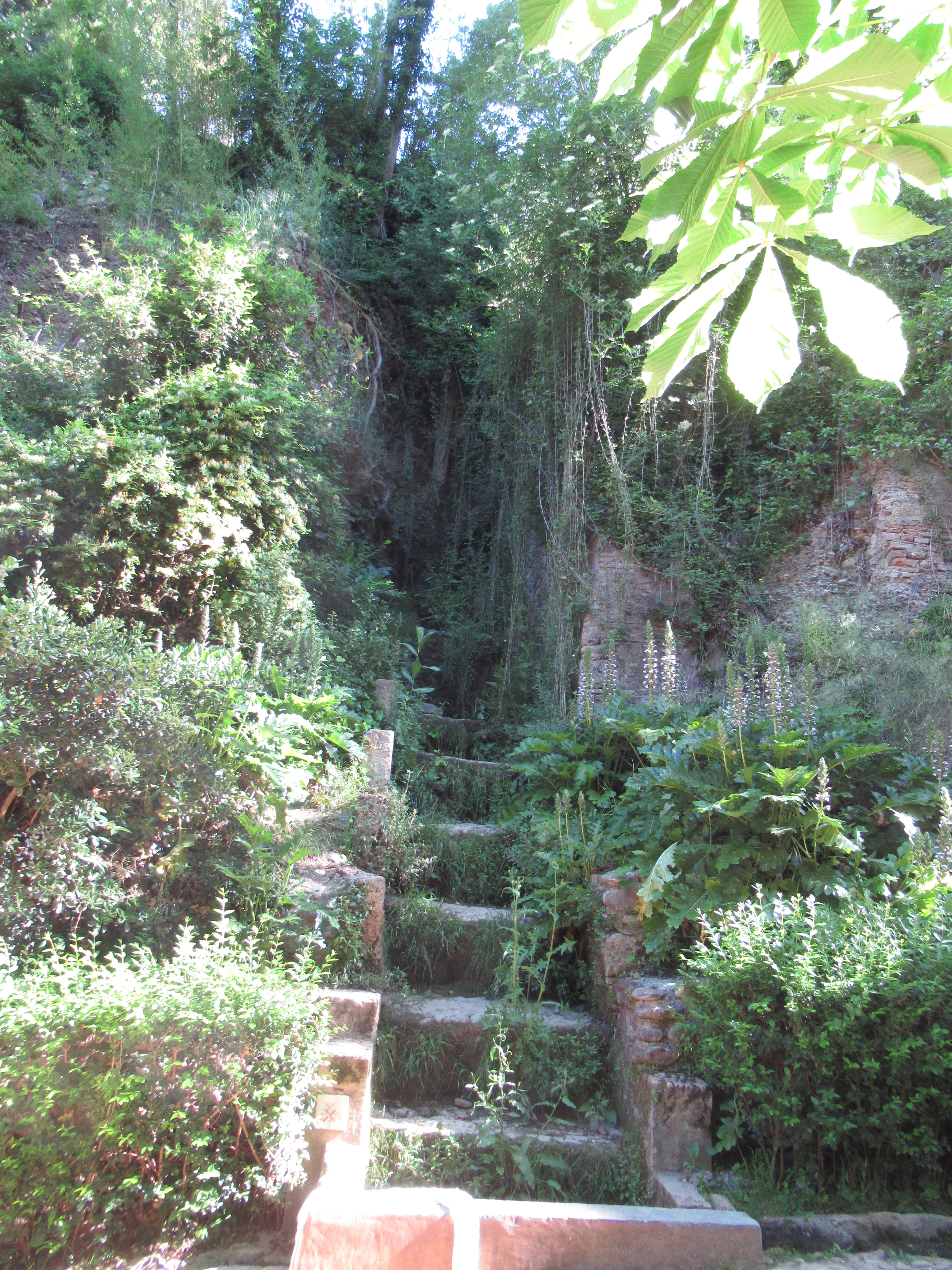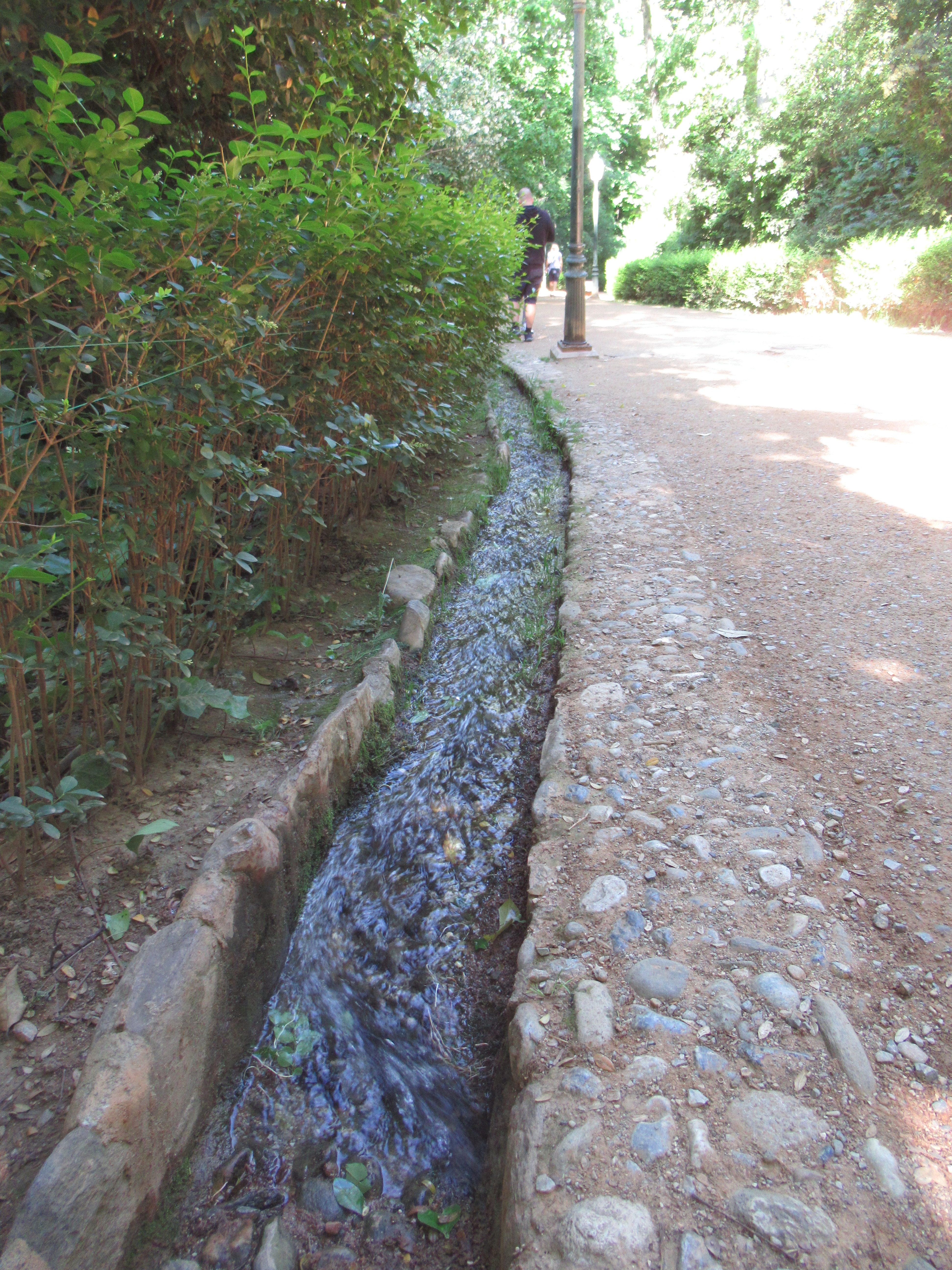 We exited the grounds of the Alhambra via the same large stone entrance gate that we had entered through. On the outer wall, as we made our way down on to the forest path there was a lovely working stone fountainThe steps that were the starting point for us to descend through the forest to the CityThrough the lush vegetation at the top of these steps, we could hear the sound of water, it ran down each of the steps and then disappeared under the forest path to the opposite sideThe water then flowed to an open stone channel and down the hill