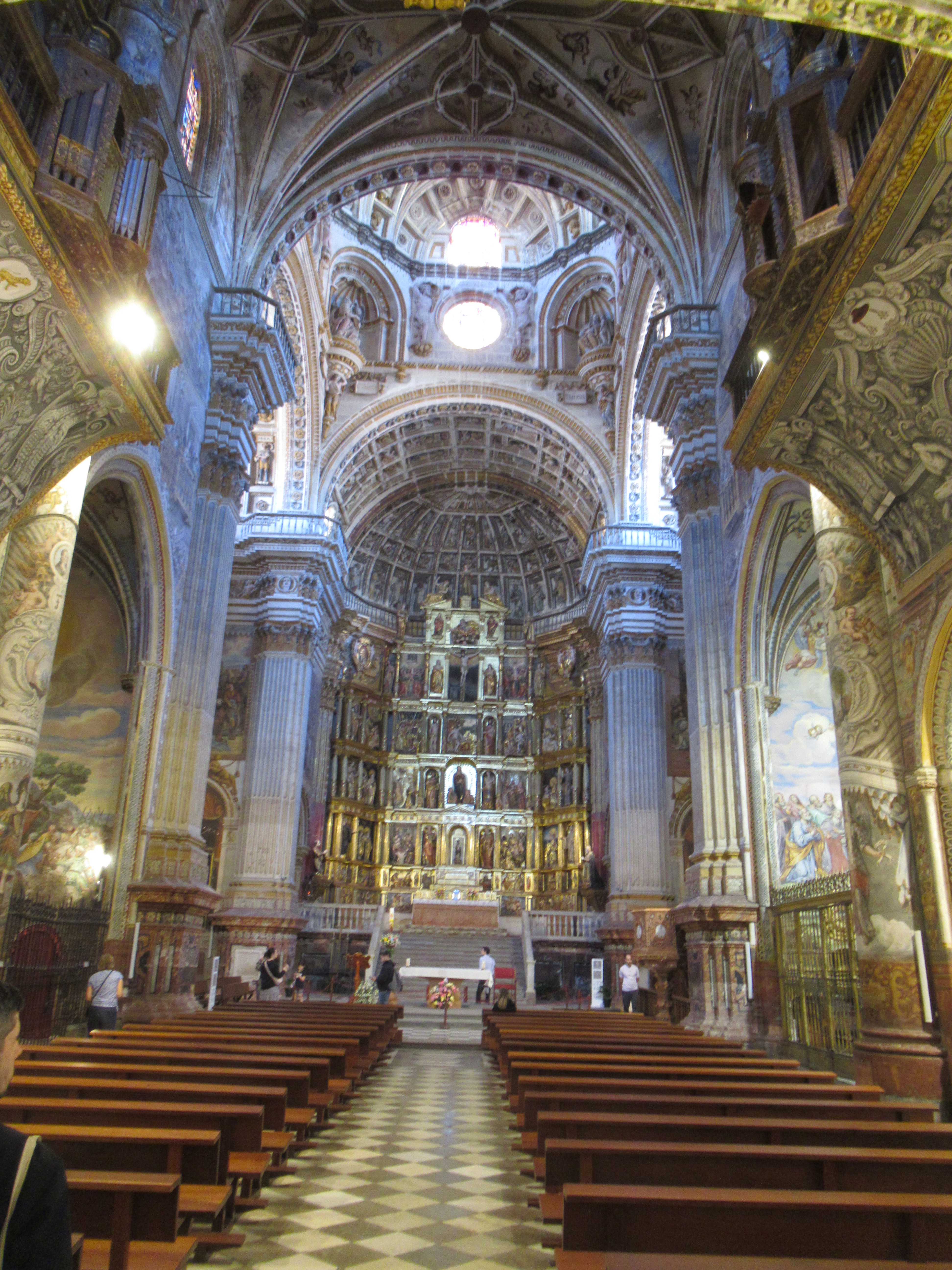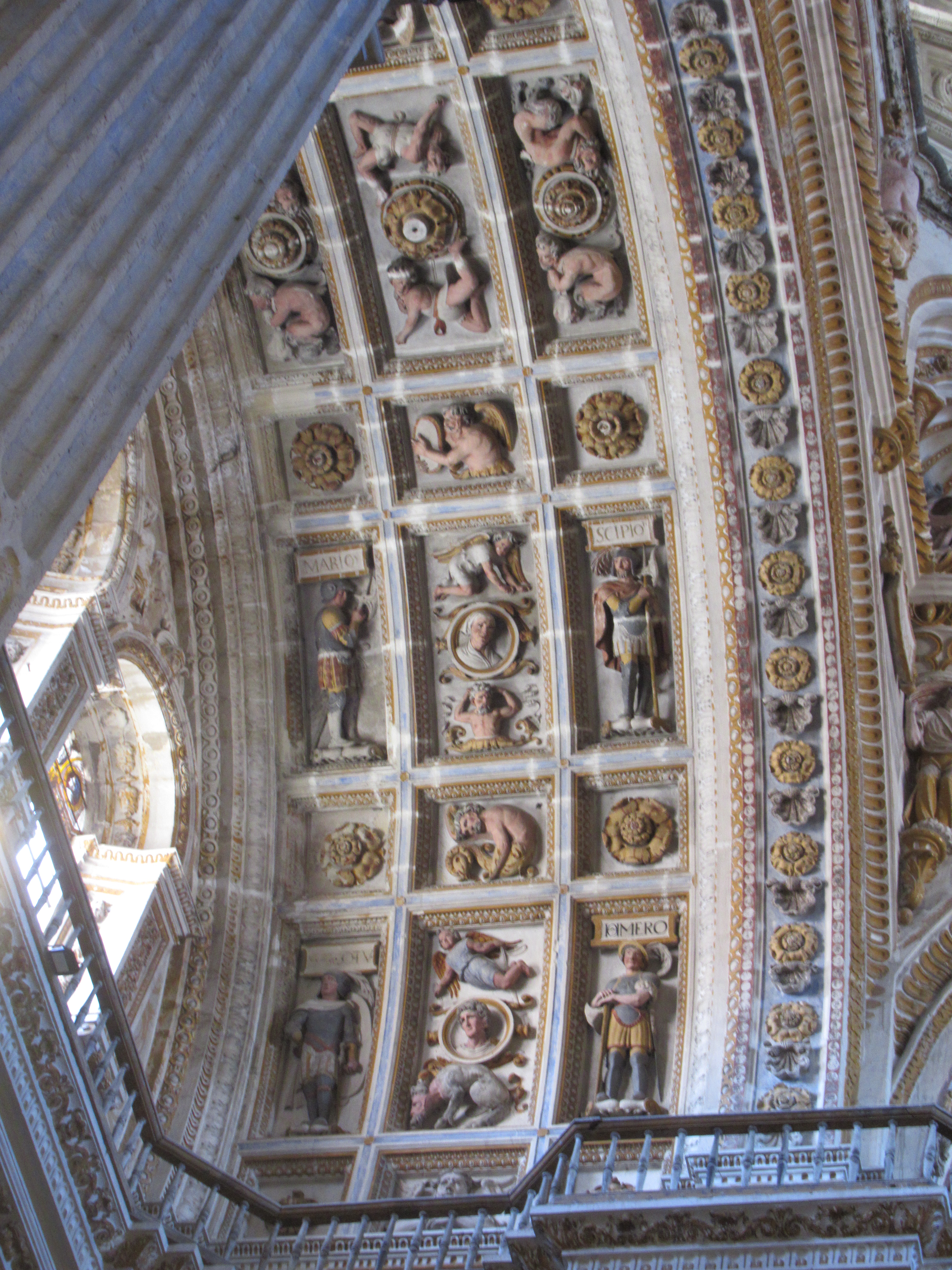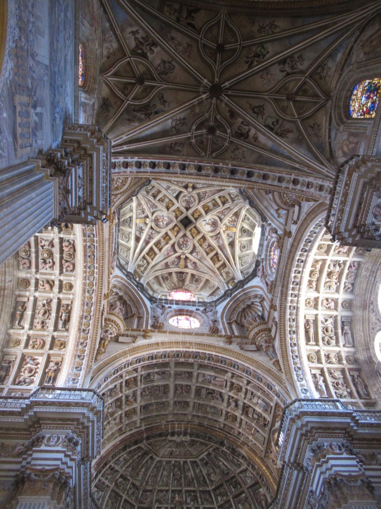 Shazza likes Religious type buildings, Churches, Cathedrals, Convents, Monasteries etc. so we went to take a look. Now as I may have previously said, other than the Cathedral there are also absolutely loads of Churches, Convents and Monasteries within the city, let alone those outside of it, but she had been drawn to this particular one for no reason that she could explain. As with a lot of these places these days, there is an admission fee, but it was only €3 each, and she said that she would like to go inside and take a look so, inside we went. Now I do not mind visiting Religious buildings, they are not at the top of my particular ‘must see’ visit locations, but some of them can be quite interesting and Convents and Monasteries in particular do tend to have nice external grounds and inner courtyards. Once inside we wandered first around the lower square quadrant that had an Orange and Lemon orchard in the middle, there were several rooms off to the side, some housing religious Artefact’s or Paintings, others were different prayer rooms and then we arrived at the main church. I let Shazza have her moment alone just wandering around, she lit a candle and then continued to wander. I sat myself on a Pew at the front, just really so that I could rest my walk weary legs until she had finished her reflective period. As I sat there in the calm and tranquil surroundings I started to let my eyes wander, as you do, and what became evident to me was the lack of the amount of Gold that I have seen in other churches, but the architecture in here was truly magnificent, in the stonework around the sides, in the central knave and in the ceiling, were small hand carved, and painted, figurines which must have taken year’s to complete. I don’t tend to ‘gush’ over most religious buildings, ‘Seville’ and ‘Burgos’ Cathedrals were the only two that actually stand out in my mind, but I do have to confess that this Monastery church was actually quite beautiful and more than worth the small entrance fee.