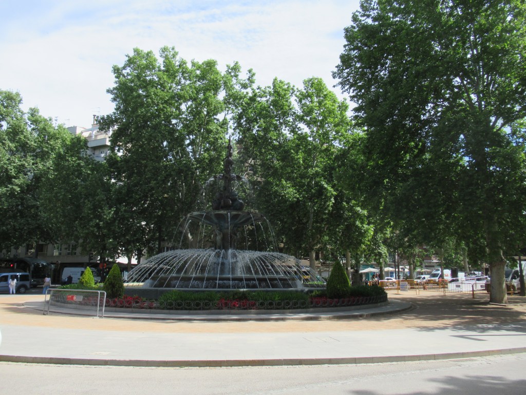 It had taken us no more than twenty-minutes from getting off the bus to getting to the river bridge, and it was a flat walk conducted at a leisurely pace, so we concluded that perhaps our two receptionists were not people who enjoyed walking very much. From the ‘Puerta Romana’ bridge we elected to turn left, away from the more built up areas of that part of the city, to just take a stroll along the very pleasant tree-lined riverside walk, although we could have opted to walk through the very nice park that ran adjacent to the riverside path. Their was a reasonable flow of water in the river but it was unusual, because it did not have the appearance of a natural river but more like a Canal, it had a concrete base and side walls, and every 100 metres or so their were, what we guessed were flood barriers. As we enjoyed the sunshine, and the views of the snow capped mountains, we could not understand why our receptionists didn’t think that their was anything of interest here, probably because it was not laden with retail outlets, cafe’s or restaurants, but to us it was so peaceful, the manicured park had various statues, mini water fountains, flower gardens and shaded benches under the trees, whilst the riverside walk provided both shade and colour too, with the gentle sound of running water that gave it such a tranquil feeling, a nice change from all the hustle and bustle of the city.
