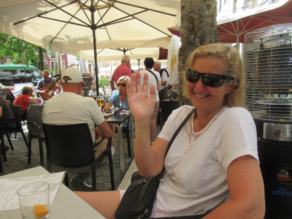 The thing about these particular establishments was that they were up more of a side side street than being in a Plaza, which made it more peaceful, apart from them being on the route where the actual ‘Tourist Train’ stopped to drop off and pick up passengers, but that ended up being entertainment in its own right. So this is where we decided we would try to get a table and partake of another leisurely lunch, if we could remember which side street it was on that is 🤔 Fortunately we did, but this time we selected a different establishment to honour our presence with, only because we preferred the menu selections, although this time our selection would not be one from the ‘Menu del Dia’ options. The young male waiter was very friendly and chatty, we said that we would be eating ‘Almuerzo’ (Lunch), but first we wanted to enjoy a drink and just look at the menu, “No problem, take your time, 15 minutes, 30 minutes an hour, no problem” he said, with a smile on his face. We ordered two ‘Vermut’s’ and with them came two Tapas on a plate, consisting of a slice of Baguette with a tomato paste spread on it and topped with a quite a sizeable piece of grilled pork fillet 😋 Sharon obviously declined her portion and said that I could have them both, “Are you sure, I could take the meat off the top and let you have the bread and tomato” I offered, “No that’s all right, you have them both” she said, well I didn’t need to be told twice 😁
