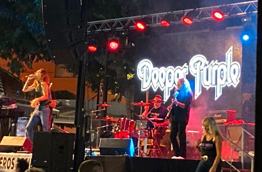 At 10:30pm, after the sun had set and the evening turned from light to dark, the main attraction took to the stage, a ‘Deep Purple’ Tribute Band called ‘Deeper Purple’ and they had the advantage of having all the stage lighting effects. However, in truth, even as a youngster when the ‘real band’ were popular, their particular musical ‘Genre’, which was ‘Heavy Rock’ was not really my style of music. It was very loud but several, let’s call them age related audience members, re-enacted their youth, with their specific type of dance moves, namely standing with legs apart, their bodies from the waist slightly bent forward, head looking down facing the ground and just shaking it up and down uncontrollably, as if they were bowing to the King, but in a much more sort of rapid succession 🙈 I turned to Shazza and shouted in her ear, “Have you seen all the oldies that are here ?”, she shouted back, “Like you, you mean” 😳