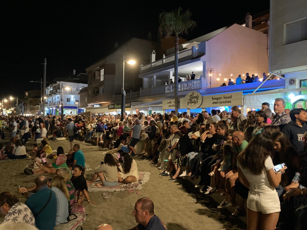 We didn’t leave home until 9:30pm and parked in our normal place in the village, unlike the previous night, the car park was fairly quiet so we did not have a problem finding a space. It was another pleasantly warm evening and so we were dressed again in shorts and short-sleeved shirts, as were the majority of other’s so we fitted in perfectly. We walked along the seafront promenade just to get a flavour of the evening, the anticipated crowds were not yet amassed, although it was much busier than a usual Sunday evening, so we we had no problems walking from one end to the other before re-tracing our steps and then diverting up towards the Plaza, where they had held the musical concert the previous evening. There was a pleasant ambience here, some of the Cafe/Bars had tables and chairs set up for a more formal Dining experience, under the external canopies, whilst other’s were just the normal Cafe/Bar set up, plastic tables and chairs, some under their canopies and other’s out in the open air. There was a wide range of age groups, from youngsters enjoying beers and chatting loudly, although there is never any loutish behaviour, family groups enjoying Tapa’s, and couples just enjoying the warm evening air, the whole atmosphere was one of casual relaxation. We sat at a table at the same Cafe/Bar we had frequented the previous evening and ordered a couple of ‘Vermuts’, which are a lighter and longer refreshing drink rather than a glass of red wine, we spent the time just chatting between ourselves, whilst also doing lots of people watching. The Cafe/Bars were all located next to each other, and it is not always obvious to distinguish which table and chairs belong to which establishment, there was lots of different chatter and laughter from the various mixed groups, the aromas of different culinary delights were constantly wafting in the air and, although we were not hungry, we were nearly tempted to order some Tapa’s as they smelt so good, but we did manage to restrain ourselves and just ordered another round of drinks. As the time passed we watched as the streams of people started to get busier and busier as they all headed towards the seafront promenade, then the Cafe/Bars started to slowly empty, we ordered a couple of coffee’s and sat just watching this mass influx before eventually electing to go and do battle ourselves.
