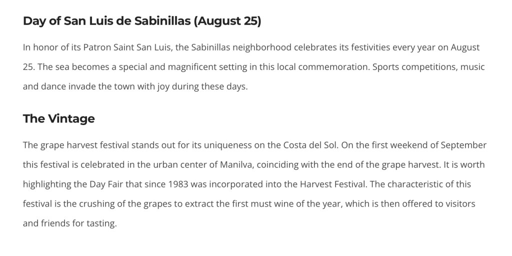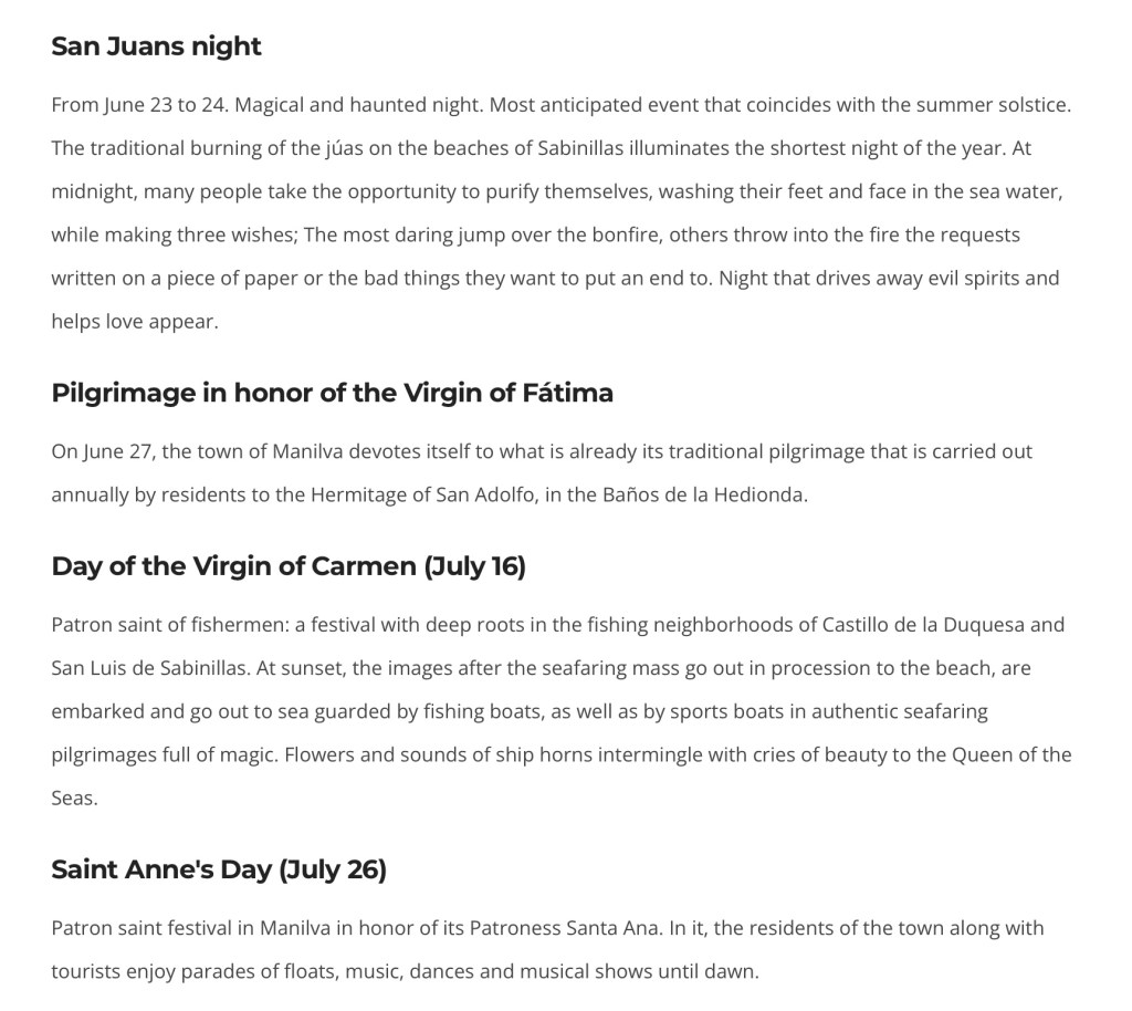 We are now entering the much busier Summer season over here, a period when lots of ‘Fiestas’ and ‘Carnivals’ will be taking place all over Spain, whilst some ‘Fiestas’ are celebrated Nationally, other’s are just localised events held within certain ‘Regional’, ‘Provincial’ or ‘Municipal’ communities. So, just by way of potential interest to some of you, I have listed below some of the events that are being held within our own local municipality, although it doesn’t list the additional Medieval Markets that will also be held in the former fishing village and our local town of San Luis de Sabinillas, however, those dates have not yet been publicised. Additionally, although Shazza and I consider the likes of Estepona (20 mins), San Pedro de Alcantara (30 mins), Marbella (40 mins) and even Malaga (60 mins) to be pretty local to us, and within our ‘Province’ of Malaga, they are not within our Municipality so they have their own calendar and schedule of events, which we currently do not have but, if last Summer was anything to go by, should mean that almost every weekend of these ‘official’ Summer months there will be something or other going off in our neck of the woods, although I am not certain that we will attend all of them again this year 🤔