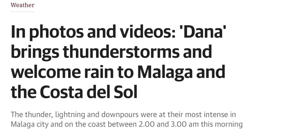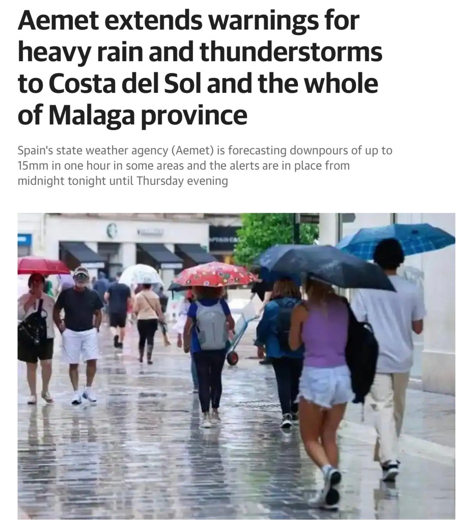 Perhaps the ‘Reporter’, who wrote that particular article, was not familiar with the Spanish eastern coastline, for although the ‘Costa del Sol’ does stretch for some 150Km (93 miles), meaning that different areas along it, can have hugely variable weather patterns, but if you had happened to have read that particular article you would have noted that they stated that these ‘Torrential Rains, and ‘Floods’, had actually occurred in the ‘Region’ of Murcia 🤷♂️ Now for those of you that are not familiar with the numerous ‘Costas’ that run down the Spanish coastline, like that newspaper reporter obviously isn’t, the Murcia region coastline is actually on the ‘Costa Calida’ and not on the ‘Costa del Sol’ and, between these two ‘Costas’ there is the Costa de Almeria (217Km long) and the Costa Tropical (75Km long). The long and the short of it being that we, here on the Costa del Sol, have not had ‘any’ rain, of any sort of significance, since the two big storms back in March, so a torrential downpour here would most certainly have been more than gratefully received, just to top up the Reservoirs a little bit, as they are now, as anticipated, beginning to lose small amounts of water through the evaporation process, but nothing for us to get concerned about. But it does just just re-enforce the fact that the Media will not let the truth, or accuracy, get in the way of a story 🤷♂️ So don’t rush to cancel your flights to Spain, unless of course you are heading towards the ‘Costa Calida’, although I suspect that even in that location the wet stuff would have disappeared by now and the sun will be shining again, as bad weather generally doesn’t last very long in Spain, and as another saying goes ‘The rain in Spain falls mainly on…the UK’ 🤭