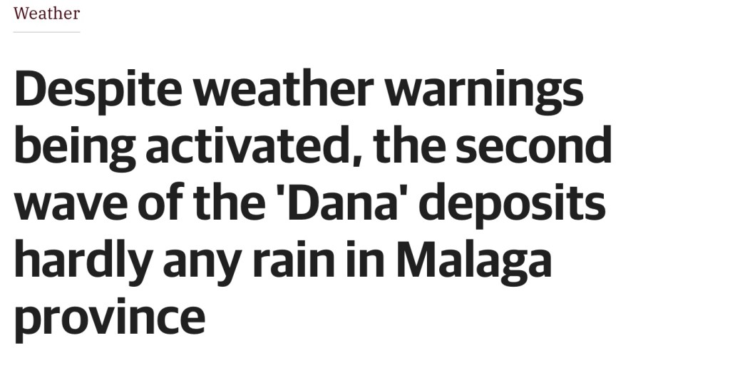 The night the ‘forecasted’ heavy rains and thunderstorms were due to commence I sat on the balcony, waiting in eager anticipation, because I do like to hear a good thunderstorm with awesome lightening displays and watch the large raindrops leaping off the roads and pavements below. However, whilst I did see some electrical storms, they were well above the thick sheet of night clouds, and a very long way out to sea, so there were just sporadic glows of white and orange and I watched them as they drifted slowly towards the African coastline. But they were not accompanied by any thunder, or rain, of any description, light or heavy, so I felt disappointed, even cheated out of my evening’s entertainment, although I guess that I should know by now not to rely on what ‘any’ weather agencies forecast, as none of them have a very good track record 🤷♂️ However, in their defence, they were not totally wrong, just geographically a little off piste, for their were floods and exceptionally strong winds in Madrid, which just in case you are not familiar with its location, is actually in Central Spain, far closer to the ‘Costa del Ajahar’ than our own Costa del Sol, and it is a little over six or perhaps even seven hours away from us, but to be completely fair, neither did they get it completely wrong about Malaga, albeit the Province of Malaga is quite a large area, however, Malaga City itself, did get some heavy rainfall, but this inclement weather once again stayed well North of us.